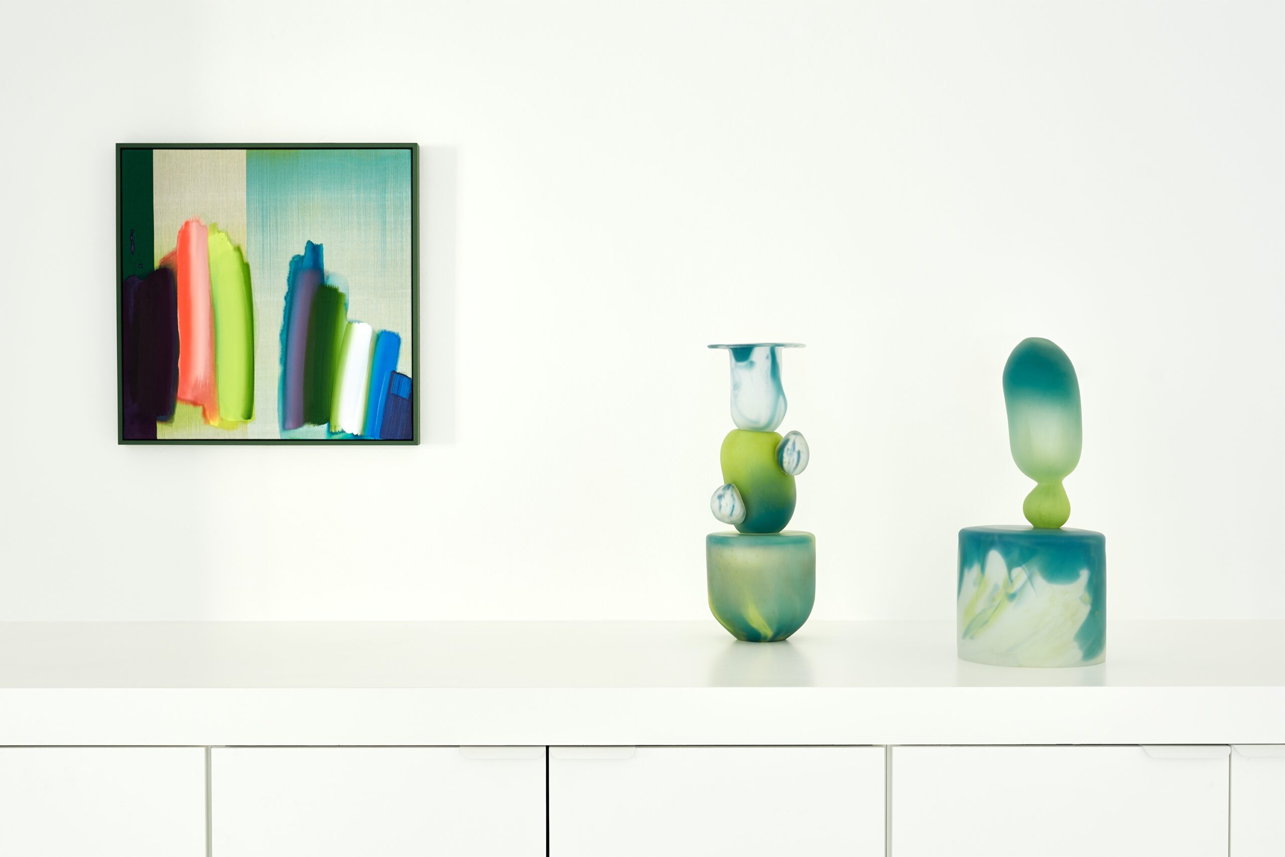 Zhao sees glass as a dynamic medium to explore themes of environment, emotions, and personal experience. Her latest collection delves into the interplay of color, form, and structure, using varying glass qualities to challenge viewers’ perceptions. Through the layering of opaque and transparent blown glass, she creates enigmatic forms that blur the boundaries between interior and exterior, sparking curiosity and emotional responses.