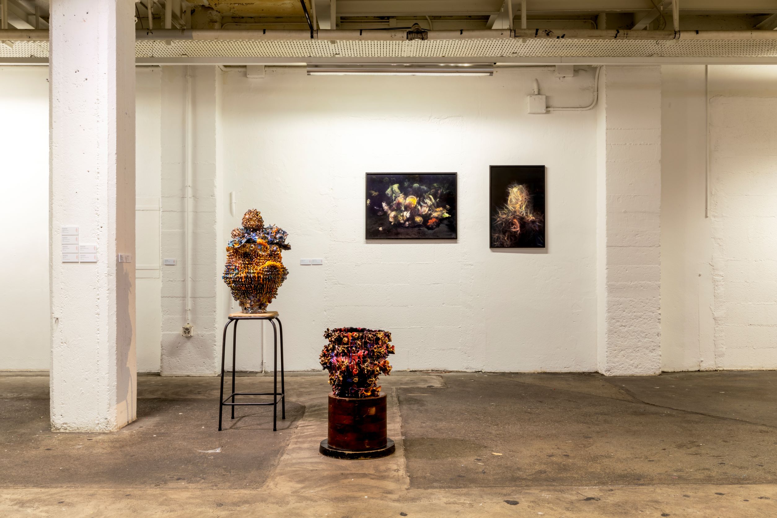 The maturity of these works belies the fact that Leonard only began working with clay in 2013. However, her ceramic practice has followed a successful painting career in her native New Zealand. Her painterly approach is evident in her current work in which she moves clay as she would have moved paint on a canvas, making the material gestural as she builds her constructions. Chronic pain has no biological value, modern medicine cannot reliably treat it; it lacks both language and voice. For Leonard the language of the clay is an attempt to rid her body of trauma and reduce her level of chronic pain. Clay is visceral, oozy and clumpy. It resembles bodily scarring but is also a precarious medium, which serves as a reminder of the fragility of her body.